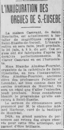 Durant sa carrière, Blanche Alméras inaugure plusieurs orgues au Québec et aux États-Unis et il arrive que les journaux de l’époque rapportent l’événement :