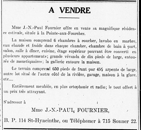 Durant cette période, il semble que la famille Fournier ait passé plusieurs étés dans une résidence secondaire qui fut mise en vente en 1930 :